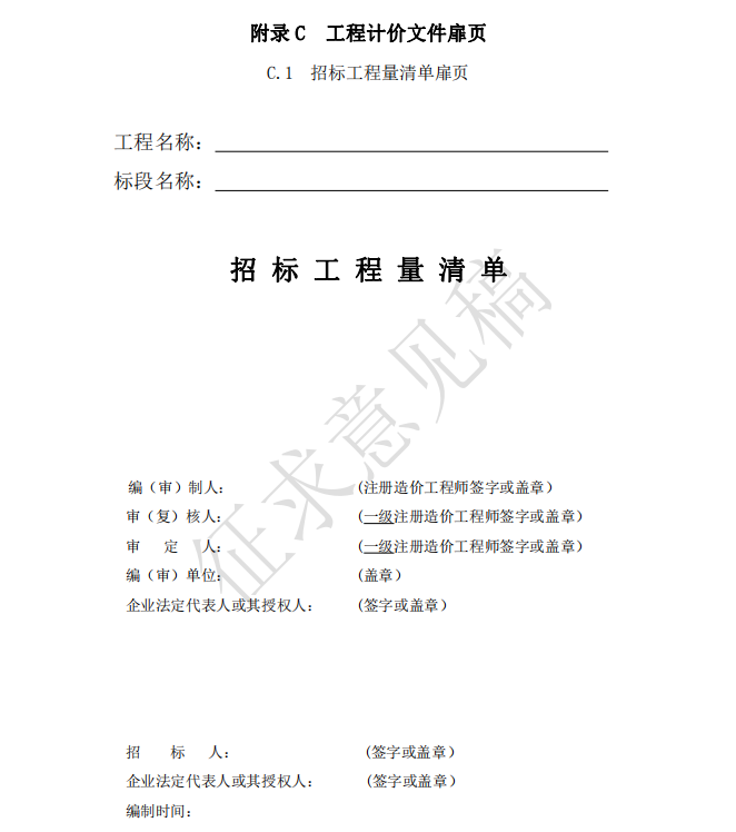 2 扉頁(yè)應(yīng)按規(guī)定的內(nèi)容填寫(xiě)、簽字、蓋章,由造價(jià)工程師編制的工程量清單應(yīng)有負(fù)責(zé)審核的 一級(jí)造價(jià)工程師簽字、蓋章。受委托編制的工程量清單,應(yīng)有一級(jí)造價(jià)工程師簽字、蓋章以及工程 造價(jià)咨詢(xún)?nèi)松w章;