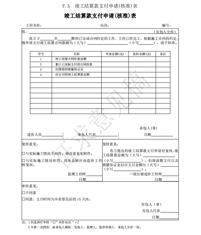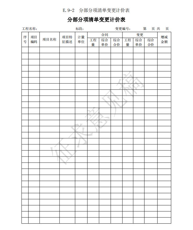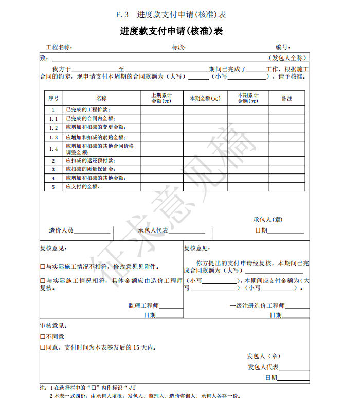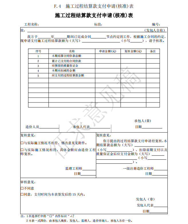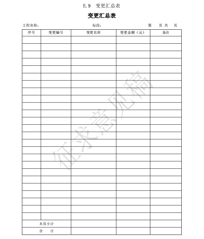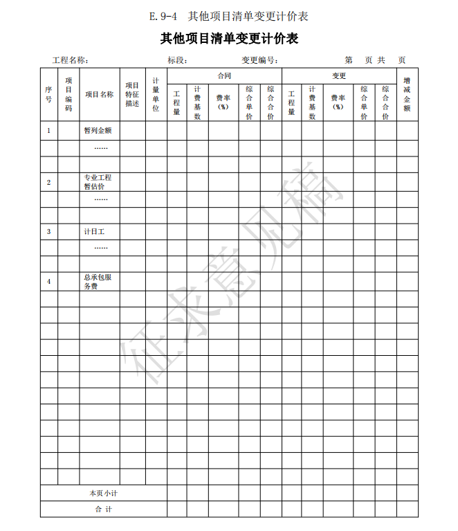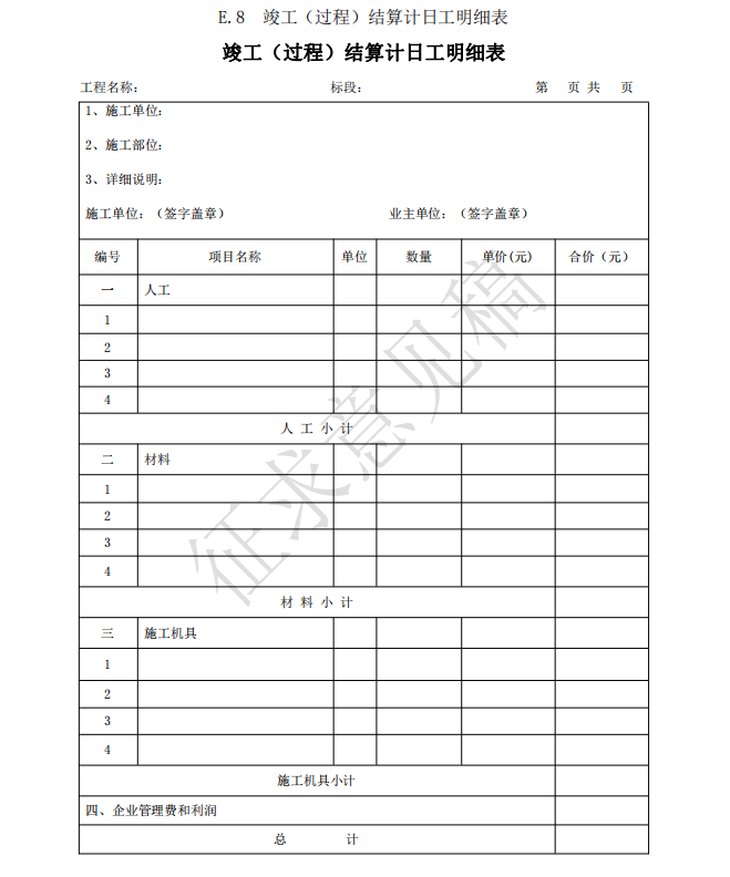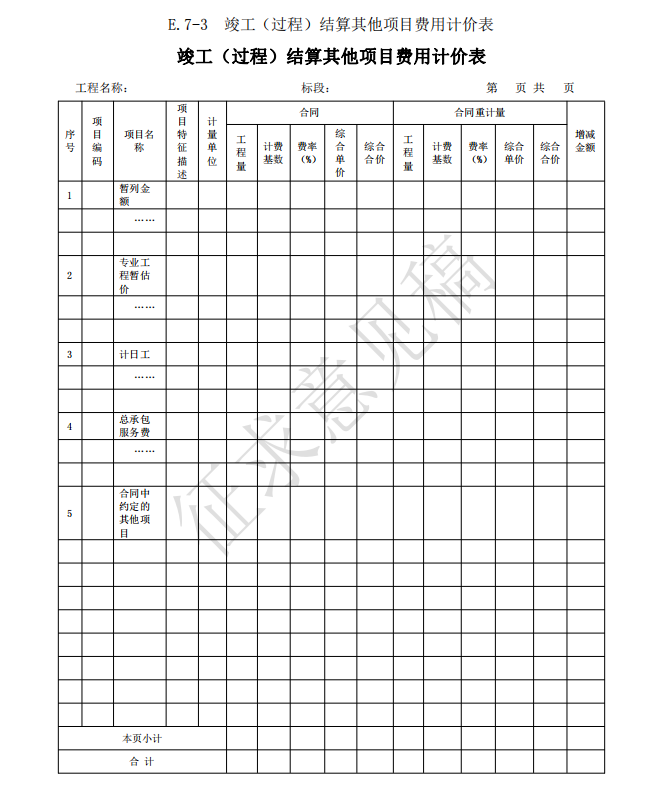 3)竣工(過(guò)程)結(jié)算使用的表格包括:B.4、C.4、D.3、E.6、E.7、E.7-1、E.7-2、E.7-3、 E.8、E.9-1、E.9-2、E.9-3、E.9-4、E.10、E.11、F.1、F.2、F.3、F.4、F.5、F.6、F.7、G.1、 G.2、G.3、G.4。