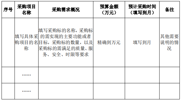 采購意向公開的內容應當包括采購項目名稱、采購需求概況、預算金額、預計采購時間等,政府采購意向公開參考文本見附件。其中,采購需求概況應當 包括采購標的名稱,采購標的需實現的主要功能或者目標,采購標的數量,以及采購標的需滿足的質量、服務、安全、時限等要求。采購意向應當盡可能清晰完 整,便于供應商提前做好參與采購活動的準備。采購意向僅作為供應商了解各單 位初步采購安排的參考,采購項目實際采購需求、預算金額和執(zhí)行時間以預算單 位最終發(fā)布的采購公告和采購文件為準。