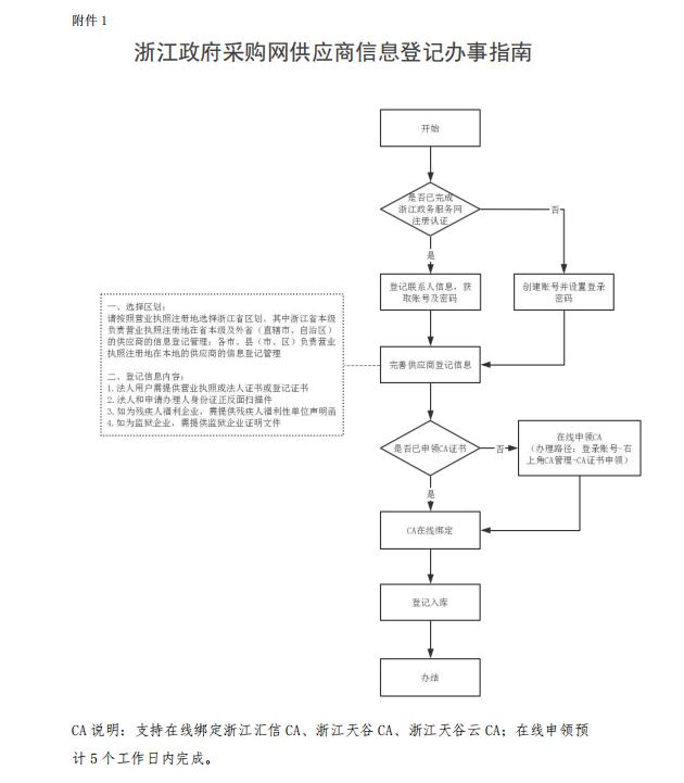 (一)凡符合政府采購法規(guī)定條件的供應(yīng)商,均可在浙江政務(wù)服務(wù)網(wǎng)(含市場(chǎng)監(jiān)督管理主管部門平臺(tái),下同)完成身份認(rèn)證,獲得登錄名及密碼,即可通過浙江政府采購網(wǎng),按要求完善登記相關(guān)信息后,獲得線上政府采購活動(dòng)操作權(quán)限。供應(yīng)商無法在浙江政務(wù)服務(wù)網(wǎng)完成身份認(rèn)證的,可通過浙江政府采購網(wǎng)“浙江政府采購供應(yīng)商信息登記管理系統(tǒng)”直接進(jìn)行信息登記,獲得相應(yīng)權(quán)限。供應(yīng)商參加電子賣場(chǎng)、項(xiàng)目電子化交易活動(dòng)的,還應(yīng)按規(guī)定程序領(lǐng)取 CA 證書。辦事指南詳 見附件 1。