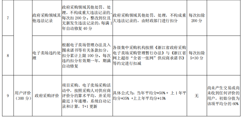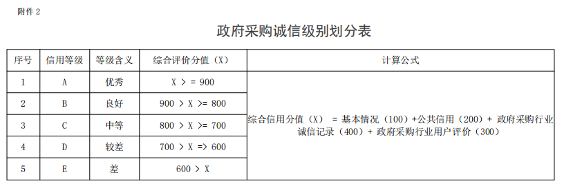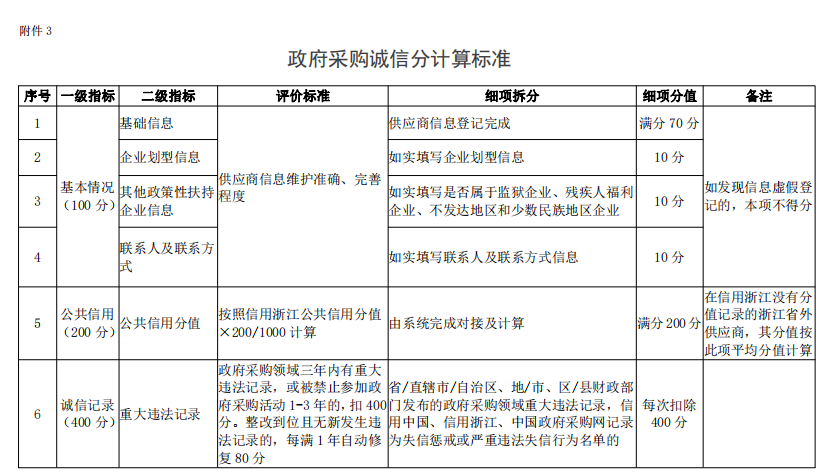 (一)浙江省政府采購供應(yīng)商按統(tǒng)一標(biāo)準(zhǔn)設(shè)置“政府采購誠信分”,總分為 1000 分,由基本情況、公共信用情況、誠信記錄和用戶評(píng)價(jià)等一級(jí)指標(biāo)組成,一 級(jí)指標(biāo)下各設(shè)若干個(gè)二級(jí)指標(biāo)。政府采購誠信分為 A、B、C、D、E 五個(gè)級(jí)別,其中A 級(jí)為政府采購紅名單。政府采購誠信級(jí)別劃分和誠信分計(jì)算標(biāo)準(zhǔn)詳見附件 2、 3,并將根據(jù)運(yùn)行情況不定期更新,同步公布于浙江政府采購網(wǎng)。