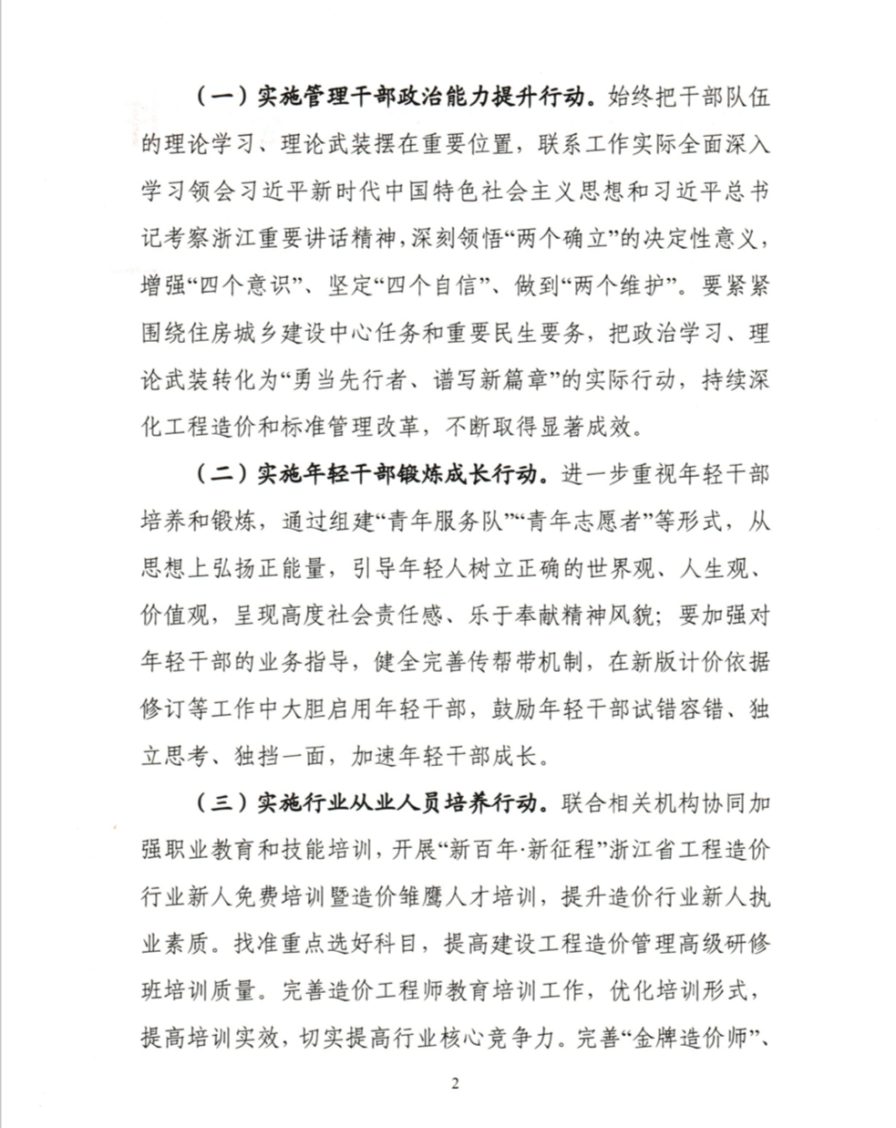 (三)實施行業(yè)從業(yè)人員培養(yǎng)行動。聯(lián)合相關機構協(xié)同加強職業(yè)教育和技能培訓,開展“新百年·新征程”浙江省工程造價行業(yè)新人免費培訓暨造價雛鷹人才培訓,提升造價行業(yè)新人執(zhí)業(yè)素質。找準重點選好科目,提高建設工程造價管理高級研修班培訓質量。完善造價工程師教育培訓工作,優(yōu)化培訓形式,提高培訓實效,切實提高行業(yè)核心競爭力。完善“金牌造價師”、“優(yōu)秀造價從業(yè)者”選樹機制,提高浙江省工程造價技能競賽專業(yè)度,不斷擴大行業(yè)內外參與度、知名度和社會影響力。繼續(xù)開展“最美造價人”選樹,提高行業(yè)人文價值、凸顯社會價值。